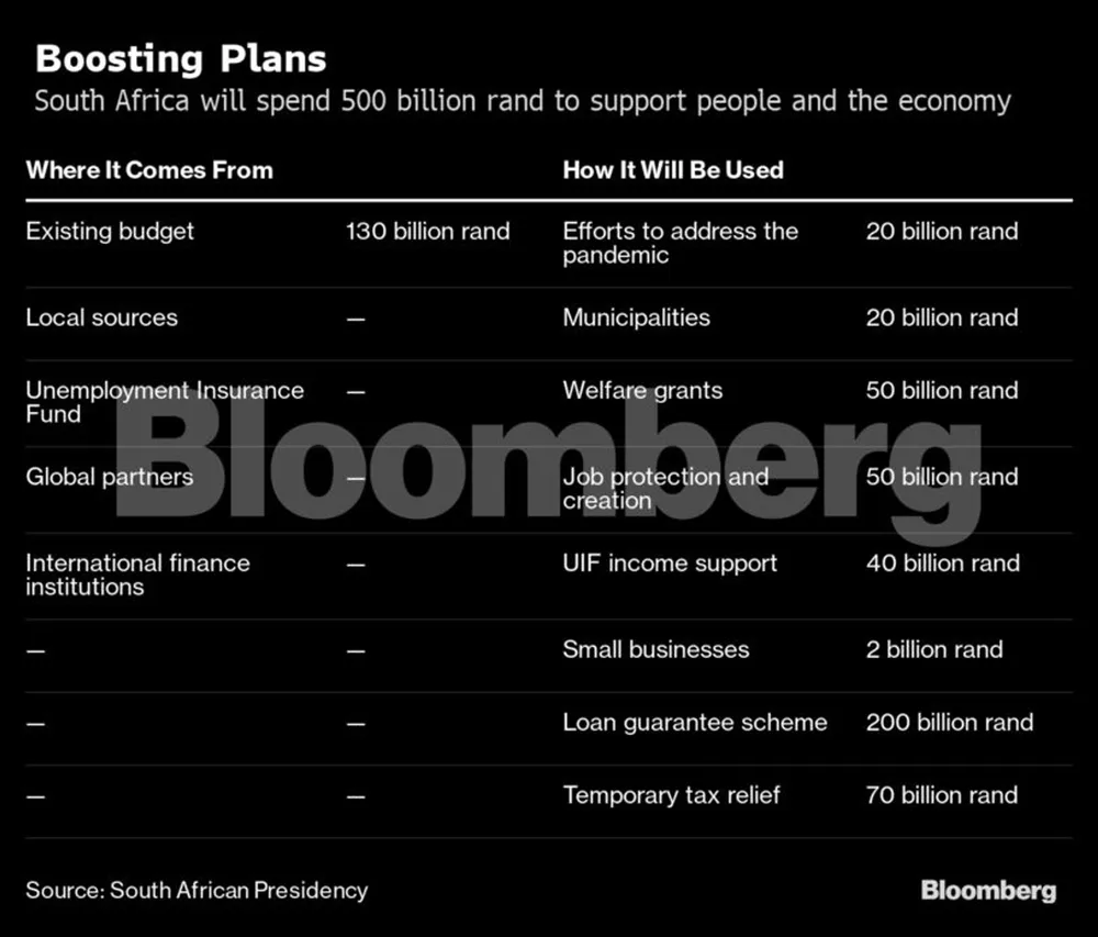 The plan will be funded by reprioritizing 130 billion rand of expenditure from existing budgets, and borrowing from domestic and international lenders, President Cyril Ramaphosa said Tuesday in a televised address to the nation. There will be 200 billion rand in guarantees for banks to encourage them to lend, a 100 billion-rand allocation to protect and create jobs and an additional 50 billion rand for welfare grants for the poor and unemployed, he said.