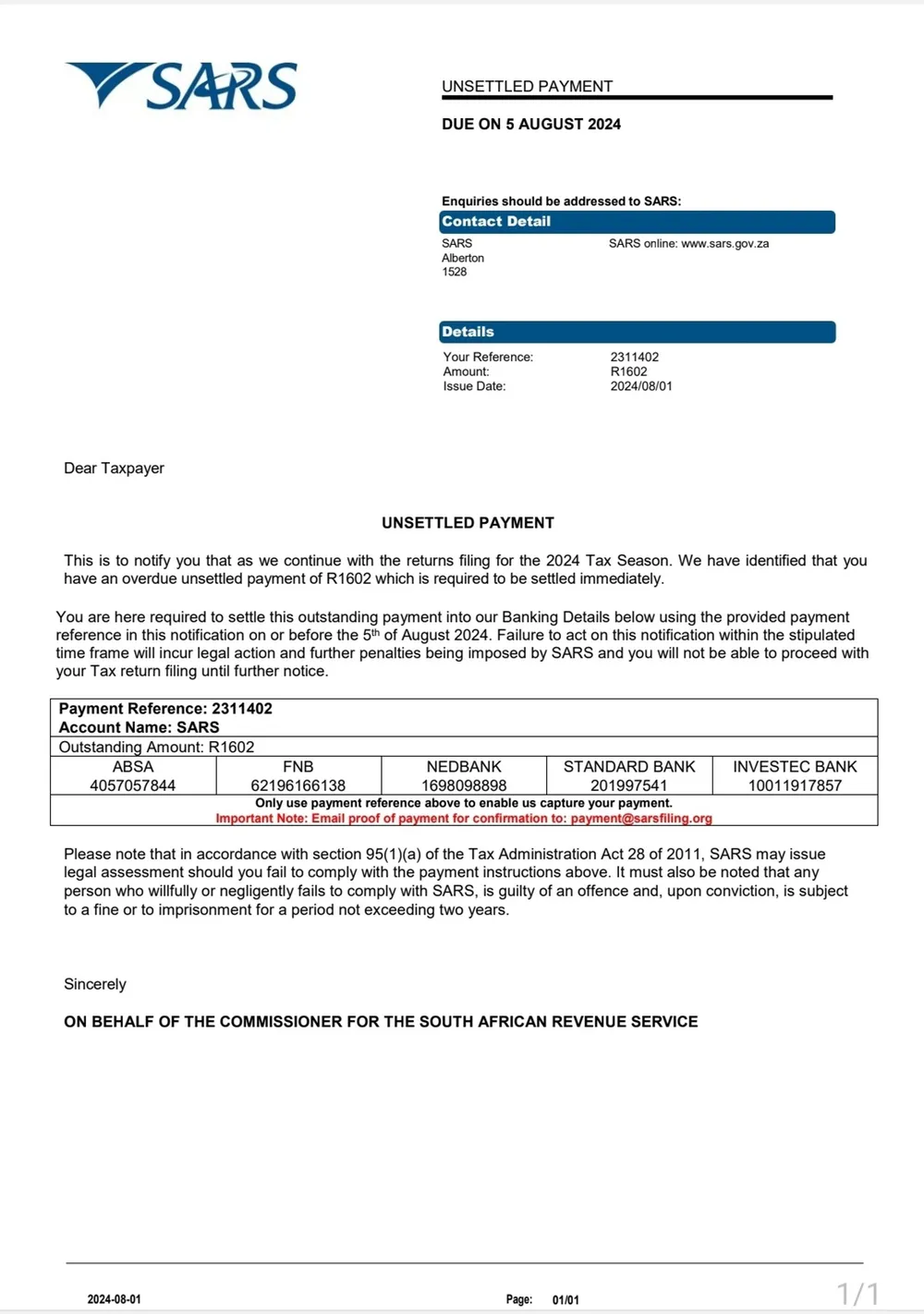 The woman received a letter that was supposedly from the South African Revenue Services (Sars) stating she has an overdue unsettled payment of R1,602 that needed to be settled immediately.