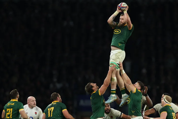 SPRINGBOK lock RG Snyman receives the ball in the line out during the Autumn Nations Series International Rugby Union match against England at Allianz Stadium in Twickenham. AFP