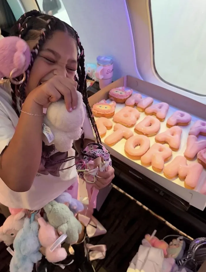 Behind her, a table full of donuts spelled out “Happy Bday Stormi,” she captioned it, “My birthday baby is 8.”