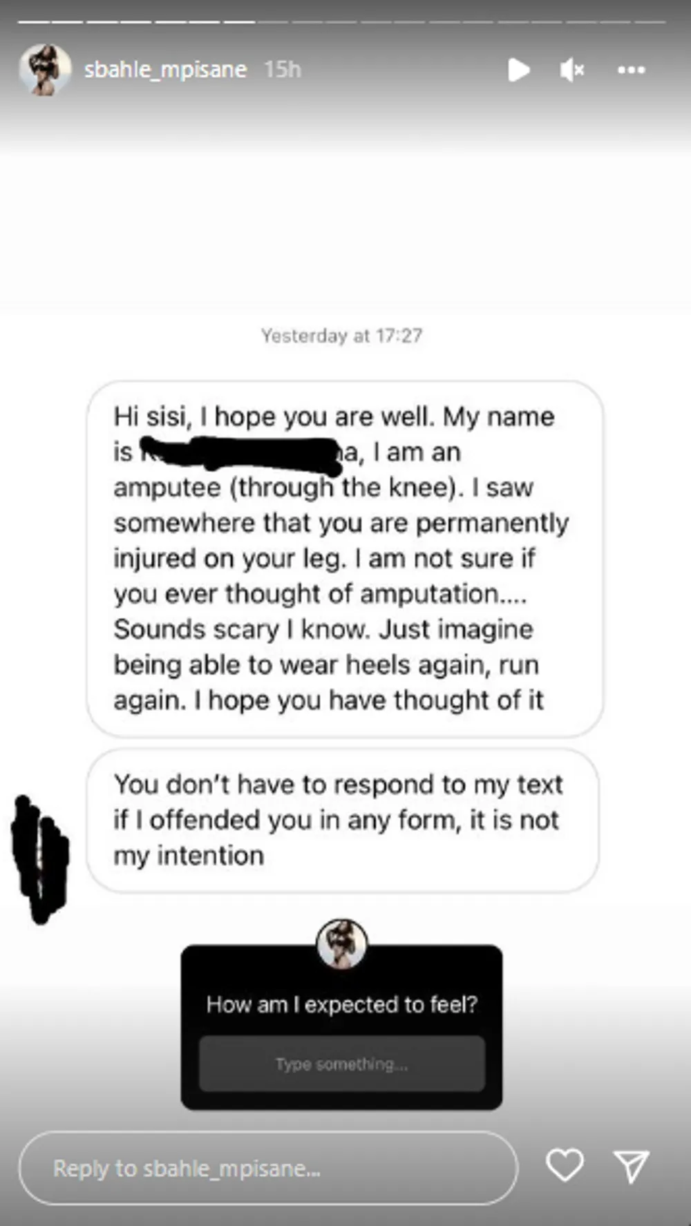 “I came across a DM from a girl, who was suggesting… because she was so nice and cute, so full of love… that I should amputate my foot so I can wear freely heels. So she was suggesting that I must go cut off my existing foot, so can run and be flexible like her,” said Mpisane during a recent Live on Instagram.