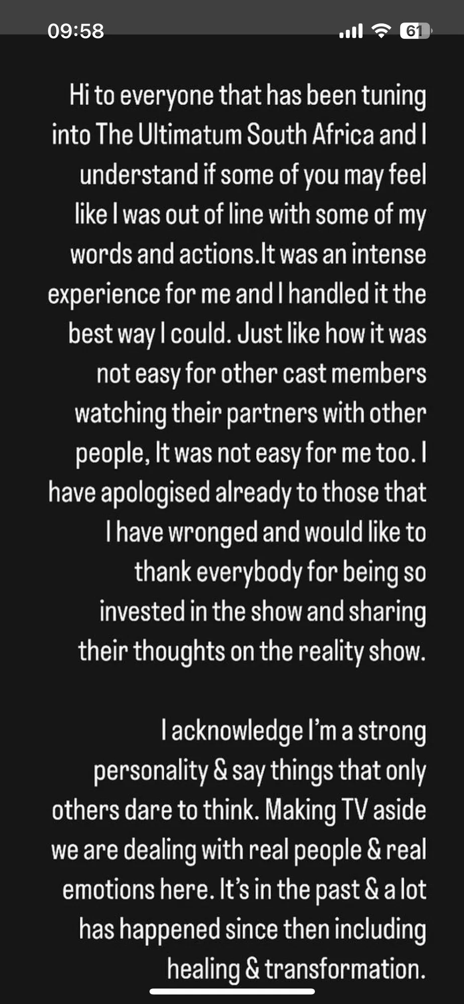 Khanya, who has been trending after viewers were shocked about how rude and brash she was towards her partner, Nkateko, and several other cast members, posted a statement on her Instagram account, acknowledging the public outcry.