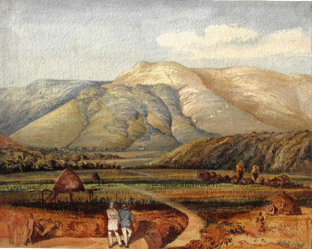 In 1853 he trekked to Grout’s Mission near Stanger via what is today Wartberg and Dalton. His final mission was an attempt to find a southern crossing into the Free State through the Southern Berg. His final unfinished painting from this unsuccessful mission shows Bamboo Mountain, and a nearby rocky outcrop that became known as Garden Castle.