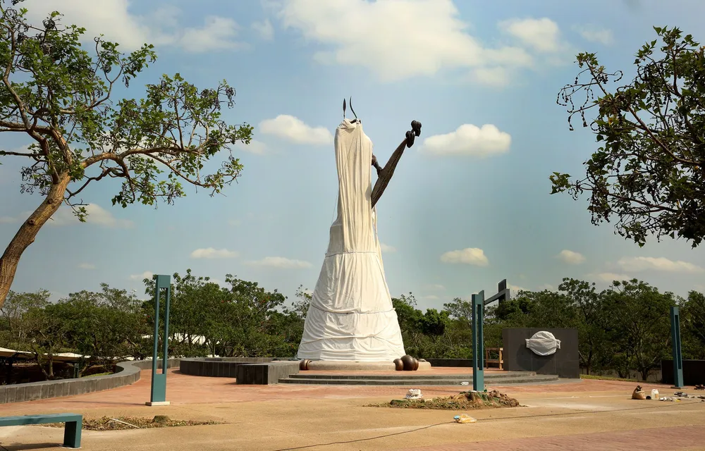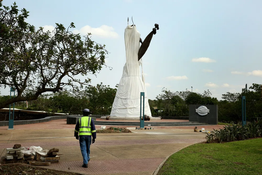 Further out of town, at King Shaka International Airport, the monarch stands 12m high but wrapped in sheeting. The original “herdboy-looking” statue, also Botha’s work, was seen as an insult and has been relegated to storage, apparently in a warehouse.