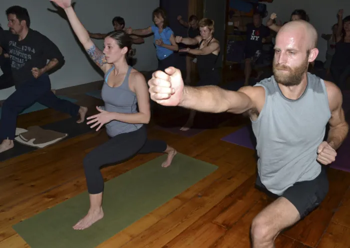People participate in a Budokon Yoga Class, in New York. People participate in a Budokon Yoga Class, in New York.