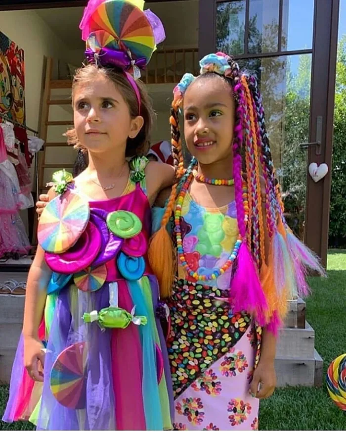 Celebrating sweet six, North had another double-party with her BFF and cousin, Penelope. Giant lollipops and gummy bears, balloon-lined walkways, streamers and candy galore, it was every child’s dream come to life. The pair donned coordinated outfits inspired by sweets, they were colourful and outlandish but totally cool. For the main attraction, the cake, this year it was iced in all white and studded with colourful candies, but the candy stuffed centre was the real ‘wow’ factor. After cutting it, it exploded with colourful treats.
