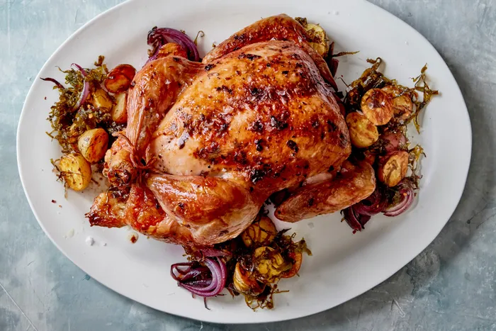 Roasted chicken seasoned with seaweed butter, and served with crisp kelp, red onions and potatoes, in Berkeley, Calif., April 2019. Kelp is delectable and nutritious, it’s easy to cook with, and it actively benefits the ocean’s health. Food styled by Vivian Lui. (Romulo Yanes/The New York Times) Roasted chicken seasoned with seaweed butter, and served with crisp kelp, red onions and potatoes, in Berkeley, Calif., April 2019. Kelp is delectable and nutritious, it’s easy to cook with, and it actively benefits the ocean’s health. Food styled by Vivian Lui. (Romulo Yanes/The New York Times)