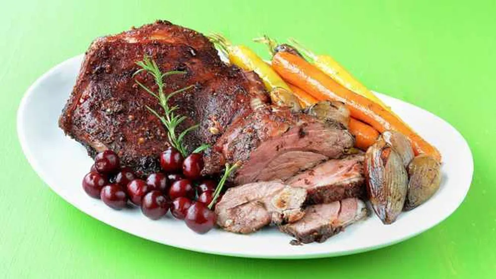 Remove from the braai, cover with foil, and rest for 10 minutes before slicing. Garnish with fresh cherries and serve with roasted shallots and carrots if desired.