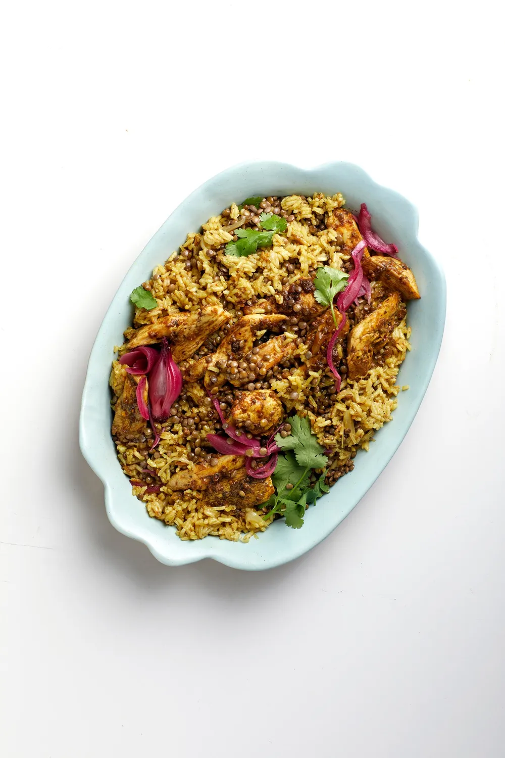 Simmer until all the liquid is absorbed and rice is cooked, about 20 minutes. Season and stir through coriander and peas.
