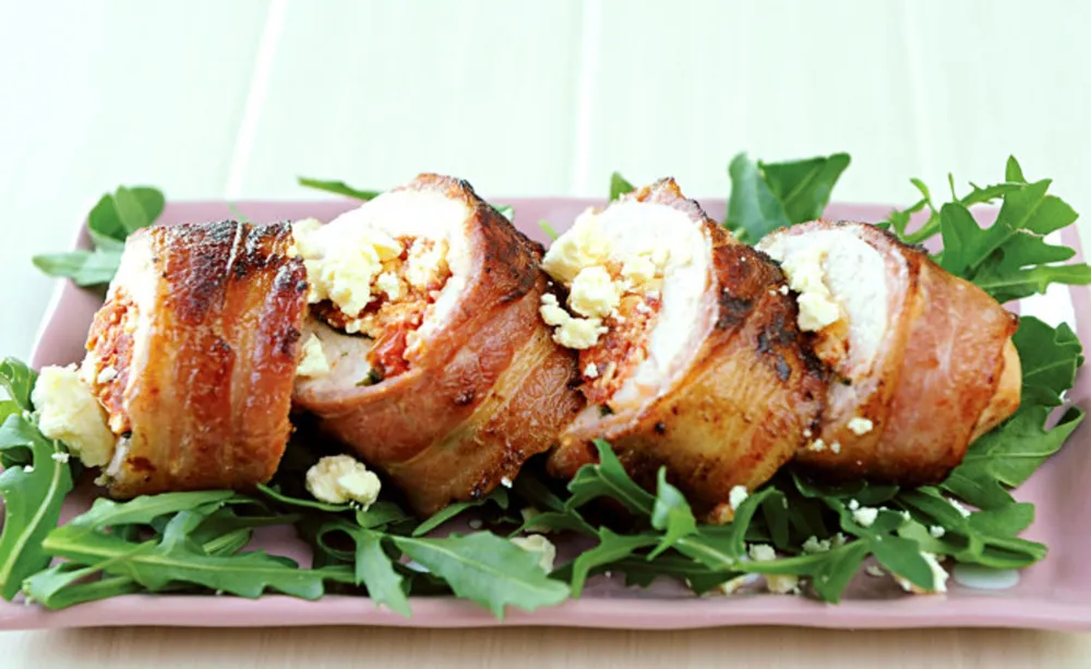 Carefully cut a cavity into the chicken breast and place some of the filling inside, seal with toothpicks if necessary.