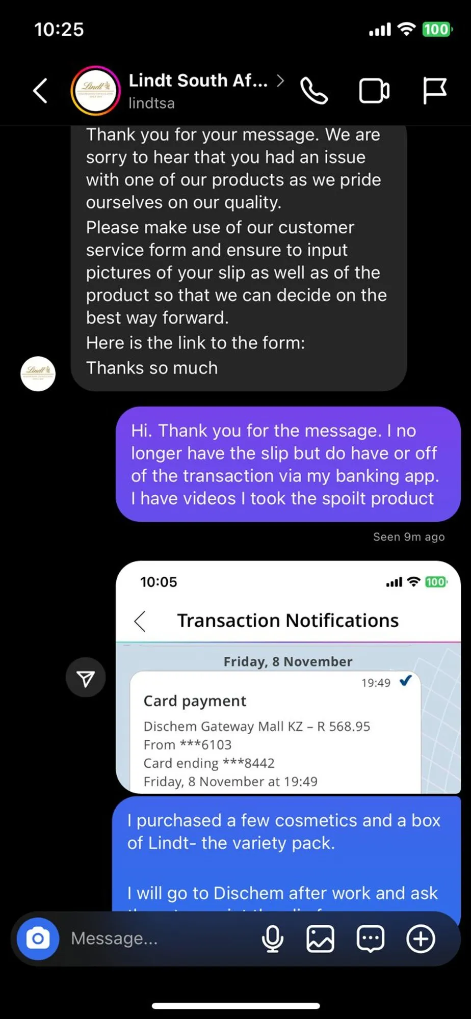 After seeing the post, Lindt South Africa reached out to her on Instagram and asked her to lodge a formal complaint.
