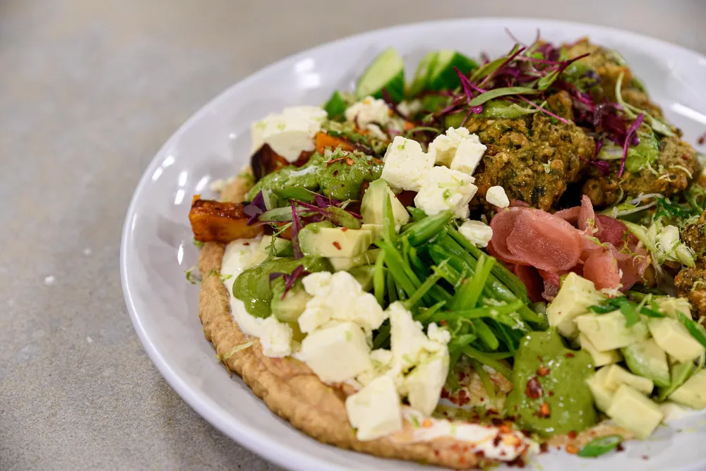 Spring buddha bowl with KOO peas in brine daltjies and green emulsion