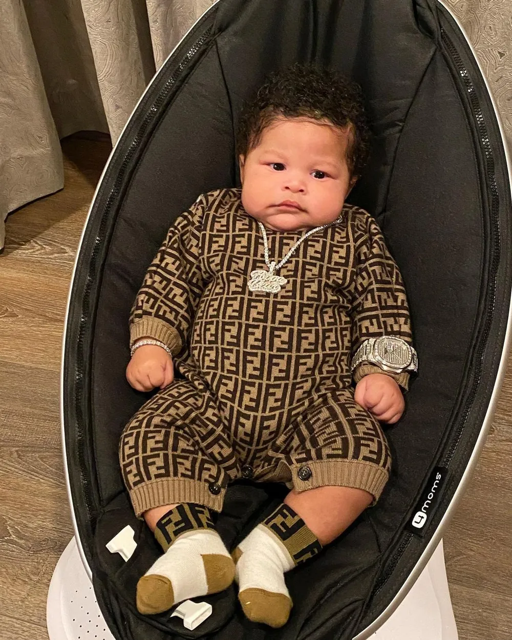 While other infants are still on the bib, Papa Bear is rocking diamond chains and watches.