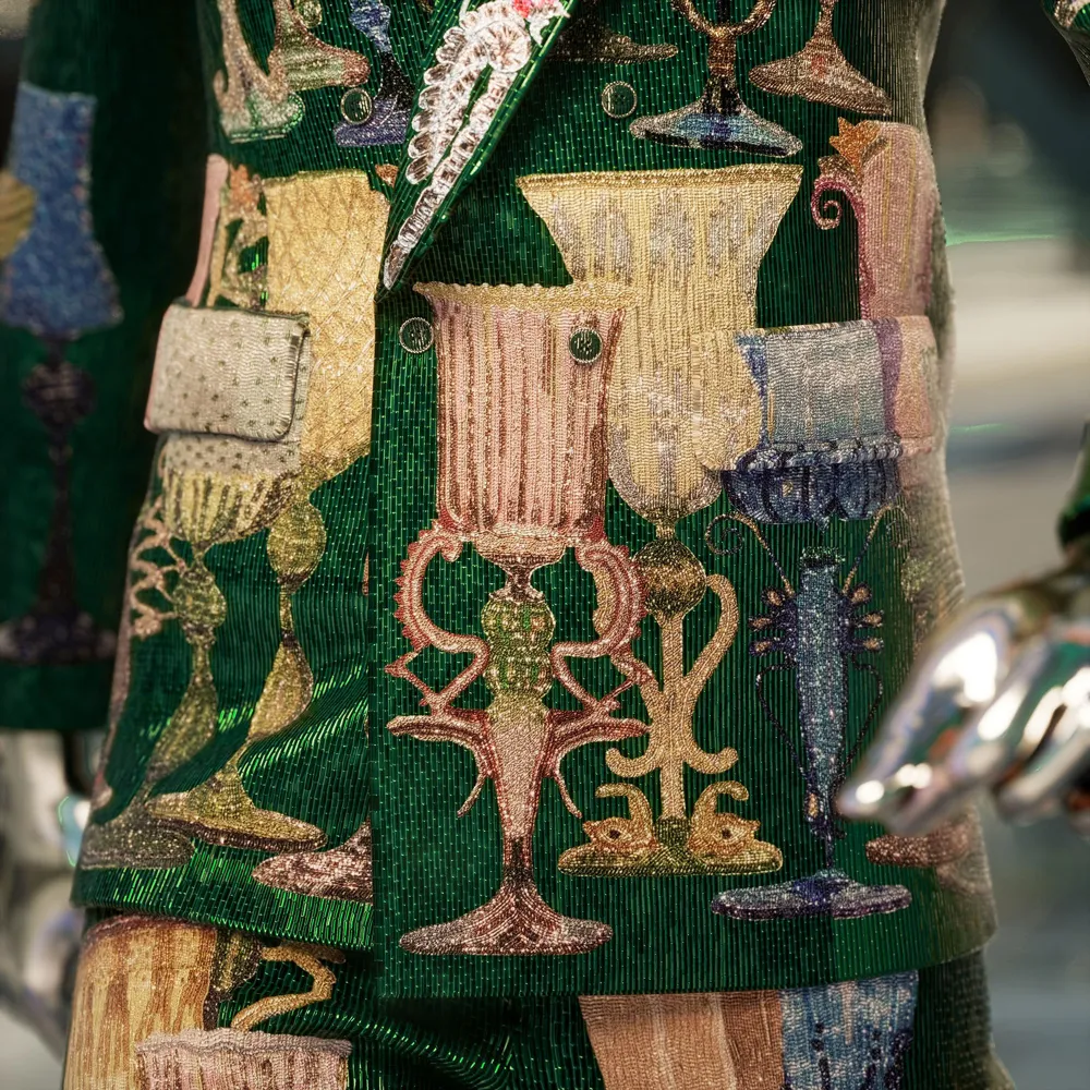 It is woven with 72 embroidered glass work pieces, with both Murano glass and Swarovski crystal in a multitude of different designs and the base contains 100% silk.