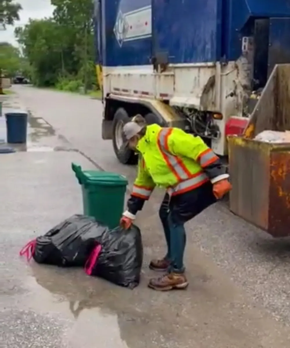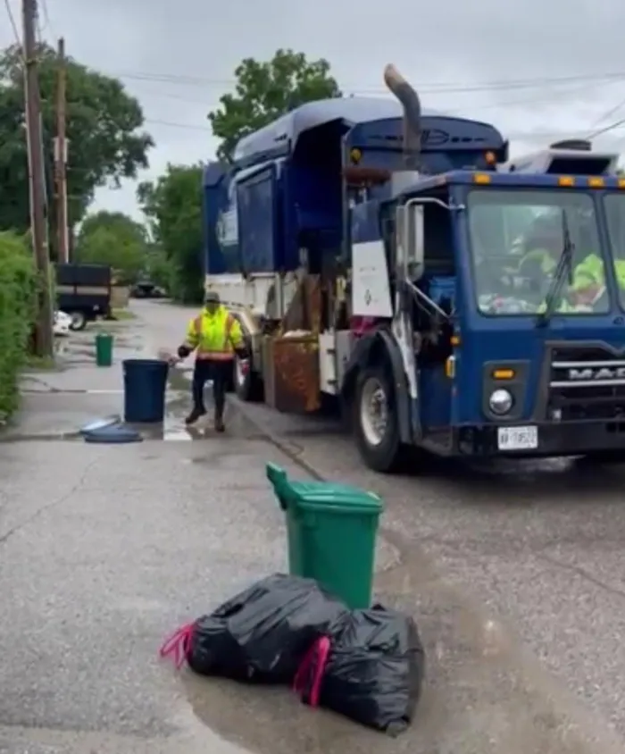 In the video, the man greets the solid waste worker as she collects garbage bags and empties bins from the side of a road in the rain.