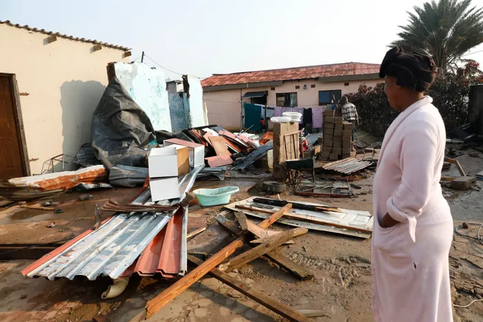 Durban – Damaged power lines lying on the ground, with corrugated iron from roofs wrapped around them, walls that caved in and homes with no roofs were among the destruction seen in Inanda on Tuesday during a visit by government officials.
