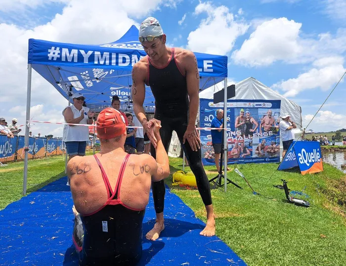 Henré Louw (right) congratules Matthew Caldwell on the victory after their photo finish in the final seeding swim for next month's Midmar Mile in Midrand on Sunday.