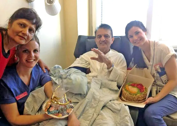 In a picture uploaded by the 65-year-old engineer on to Facebook, Vinod and his wife Nilam are smiling with two nurses as they pose with a birthday cake.