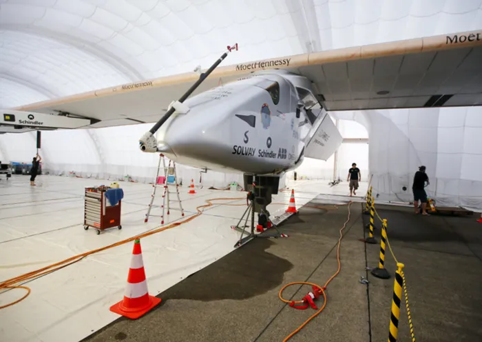 The Solar Impulse 2, a solar powered plane, is parked in an inflatable hangar after an unscheduled landing at Nagoya airport in Japan on Wednesday. Photo: Thomas Peter/Reuters. The Solar Impulse 2, a solar powered plane, is parked in an inflatable hangar after an unscheduled landing at Nagoya airport in Japan on Wednesday. Photo: Thomas Peter/Reuters.