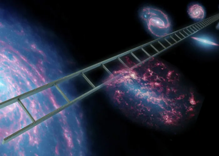 An artist's composite shows the cosmic distance ladder used to measure the size and age of the universe. An artist's composite shows the cosmic distance ladder used to measure the size and age of the universe.