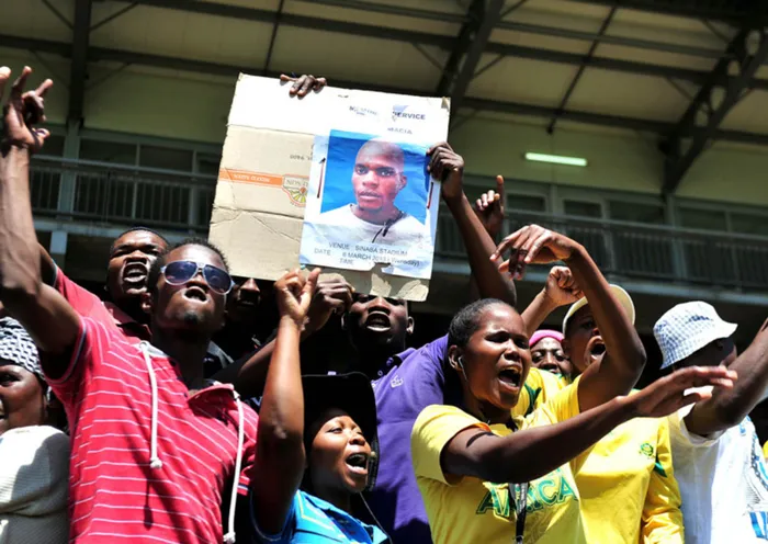 404 Community members carry Mido Macia's picture as they sing slogan songs during a memorial service held at Daveyton stadium for the slain taxi driver. 060313. Picture: Bongiwe Mchunu 404 Community members carry Mido Macia's picture as they sing slogan songs during a memorial service held at Daveyton stadium for the slain taxi driver. 060313. Picture: Bongiwe Mchunu
