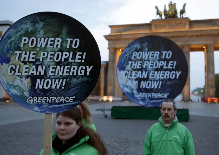 Activists of the international environmentalist organization Greenpeace pose with posters in front of the Brandenburg Gate in Berlin, Germany, Sunday, April 13, 2014 to support clean energy. After a one week meeting of the Intergovernmental Panel on Climate Change in Berlin the final document which is released on Sunday is expected to say that a global shift to renewable energy from fossil fuels like oil and coal are required to avoid potentially devastating sea level rise, flooding, droughts and other impacts of warming. (AP Photo/Michael Sohn) Activists of the international environmentalist organization Greenpeace pose with posters in front of the Brandenburg Gate in Berlin, Germany, Sunday, April 13, 2014 to support clean energy. After a one week meeting of the Intergovernmental Panel on Climate Change in Berlin the final document which is released on Sunday is expected to say that a global shift to renewable energy from fossil fuels like oil and coal are required to avoid potentially devastating sea level rise, flooding, droughts and other impacts of warming. (AP Photo/Michael Sohn)