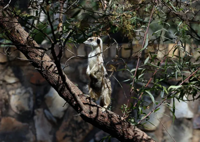 A meerkat stands on a tree brunch in an enclosure at the Pretoria Zoo. A meerkat stands on a tree brunch in an enclosure at the Pretoria Zoo.