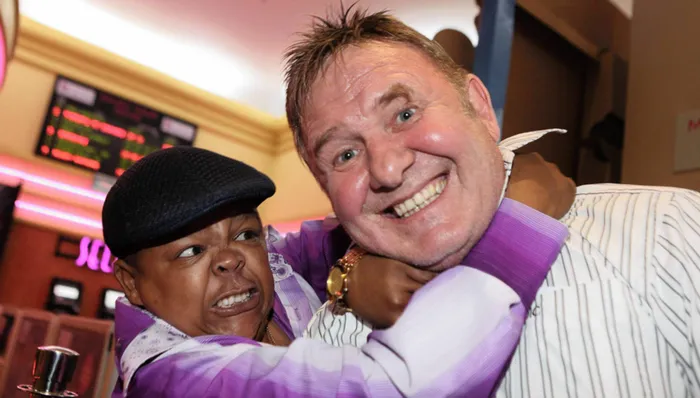 Alfred Ntombela strangles Leon Schuster at the media screening of Mad Buddies at the Suncoast Casino cinemas. Picture: Marilyn Bernard Alfred Ntombela strangles Leon Schuster at the media screening of Mad Buddies at the Suncoast Casino cinemas. Picture: Marilyn Bernard