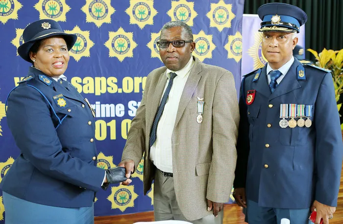 Major-General Kabelo Mekute, provincial head of legal policy, congratulates Captain Phumula Ngidi who received a medal for serving in the Saps for 30 years, and Brigadier Gerald Singh, acting cluster commander, yesterday. Picture: Sibonelo Ngcobo Major-General Kabelo Mekute, provincial head of legal policy, congratulates Captain Phumula Ngidi who received a medal for serving in the Saps for 30 years, and Brigadier Gerald Singh, acting cluster commander, yesterday. Picture: Sibonelo Ngcobo