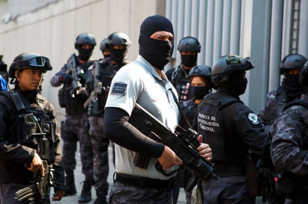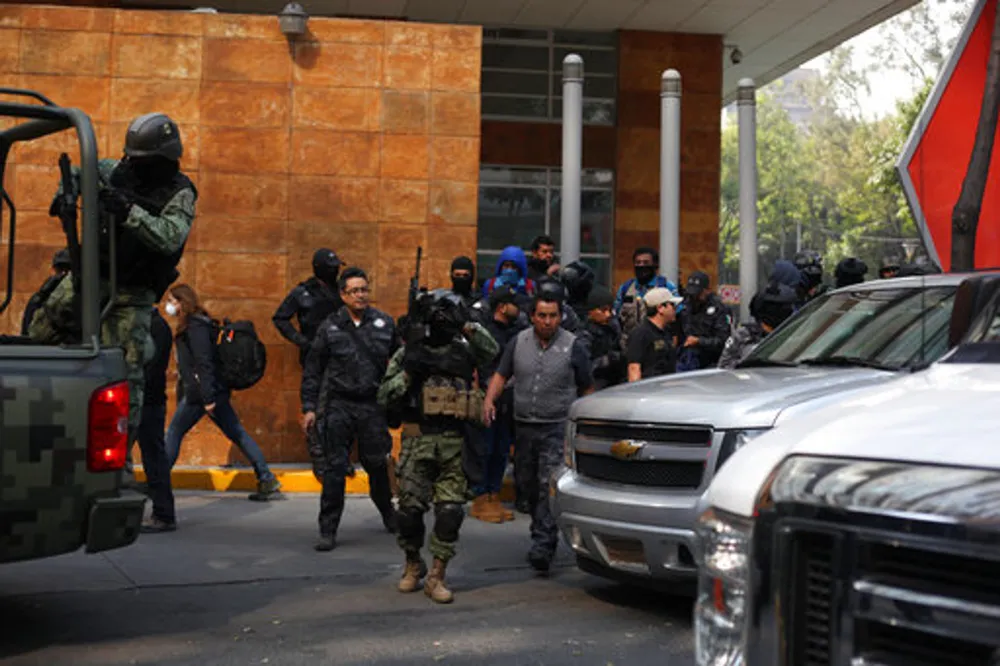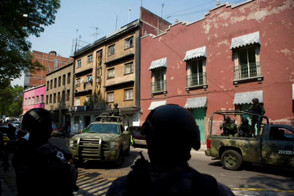 The office distributed photos showing soldiers in full battle gear guarding the entrance of an upscale apartment building on a major boulevard in Mexico City, not far from downtown.