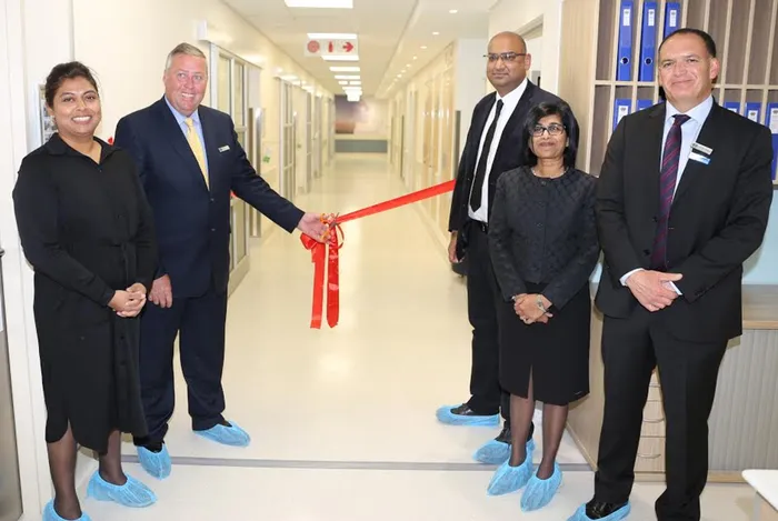 Pictured at the opening the new dedicated haematology unit at Netcare uMhlanga Hospital were, from left to right: Dr Natasha Sewpersad, clinical haematologist; Jacques du Plessis, managing director of the Netcare hospital division; Dr Rohaan Badree and Dr Dhaya Moodley, both clinical haematologists; and Dr Richard Friedland, chief executive officer of the Netcare Group. Picture: Supplied Pictured at the opening the new dedicated haematology unit at Netcare uMhlanga Hospital were, from left to right: Dr Natasha Sewpersad, clinical haematologist; Jacques du Plessis, managing director of the Netcare hospital division; Dr Rohaan Badree and Dr Dhaya Moodley, both clinical haematologists; and Dr Richard Friedland, chief executive officer of the Netcare Group. Picture: Supplied