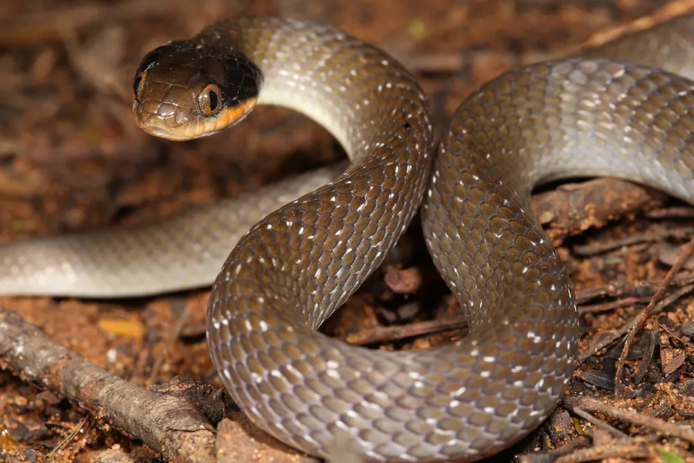 The Herald Snake: A grey snake whose head is darker in colour than the rest of the body with white speckles which can usually be seen on the body. They have pale-coloured top ‘lips’, which can sometimes be orange/red in colour, hence the common name, Red-lipped Herald. They feed on frogs.