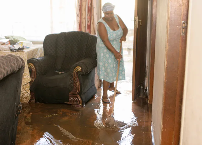 IN AN all too familiar exercise, Norah Zulu mops the floor from her home after a municipal water pipe burst and flooded the house. This is the third time in the past two years that this has happened. Photo: Bongani Mbatha/African News Agency(ANA). IN AN all too familiar exercise, Norah Zulu mops the floor from her home after a municipal water pipe burst and flooded the house. This is the third time in the past two years that this has happened. Photo: Bongani Mbatha/African News Agency(ANA).
