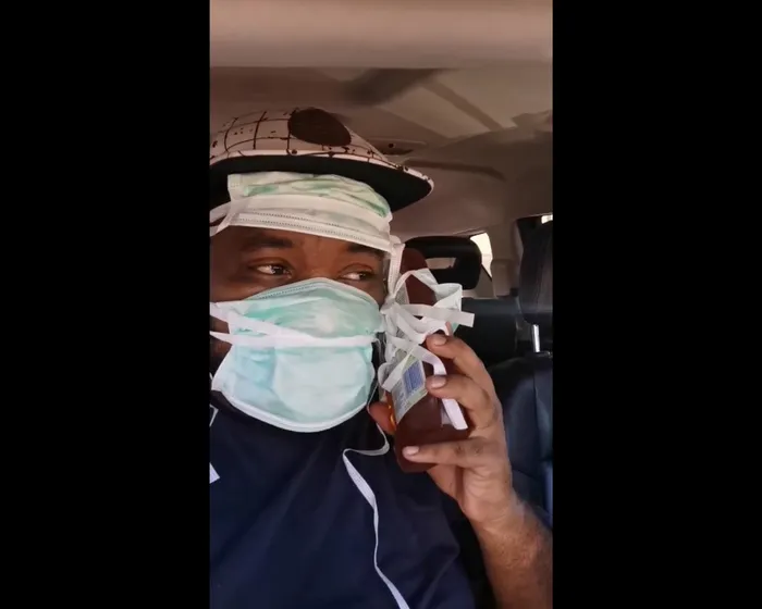 Goldstone is on the phone with a bottle of Dettol with a face mask over it, telling the person on the other end that he had placed himself in quarantine in his car.