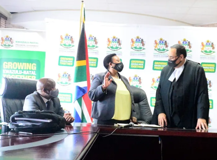 Nomusa Dube-Ncube who was in charge of the powerful Economic Development and Tourism and Environmental Affairs portfolio was moved to Finance. She was sworn in by KZN Judge President, Jappie Achmat. Picture: Supplied.