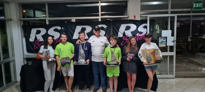 Junior sailors from KwaZulu-Natal have been selected to represent South Africa in Denmark at the World Championships in August 2021. They are, from left, Hannah Sasman, Patrick Kessel, Roux le Roux, Gert le Roux (Race Organiser and Chairman of RS Tera South Africa), Sean Kavanaugh, Eryn Honicke and Kaylynn Smit. Picture: Debra Taaffe