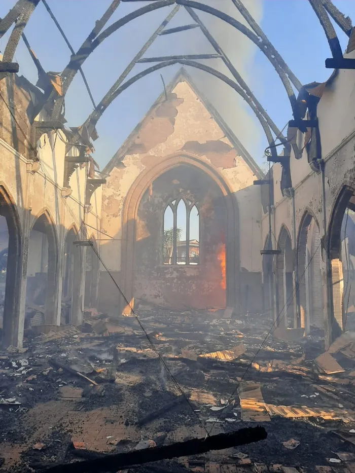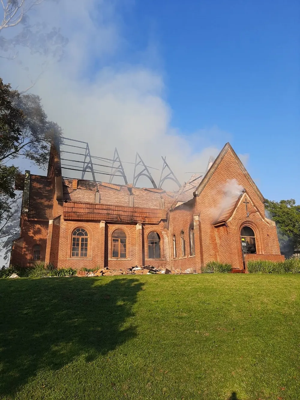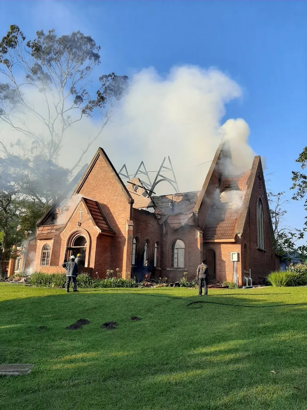 “EThekwini Fire Department division’s Bruce De Gier and his team responded to Inanda Seminary at 07:24 this morning. The first fire truck arrived at 07:38 from our Ntuzuma Fire Station, with vehicles from Phoenix, Umhlanga and Verulam arriving soon after. The Church was seen to be well alight, with no other buildings next to it.