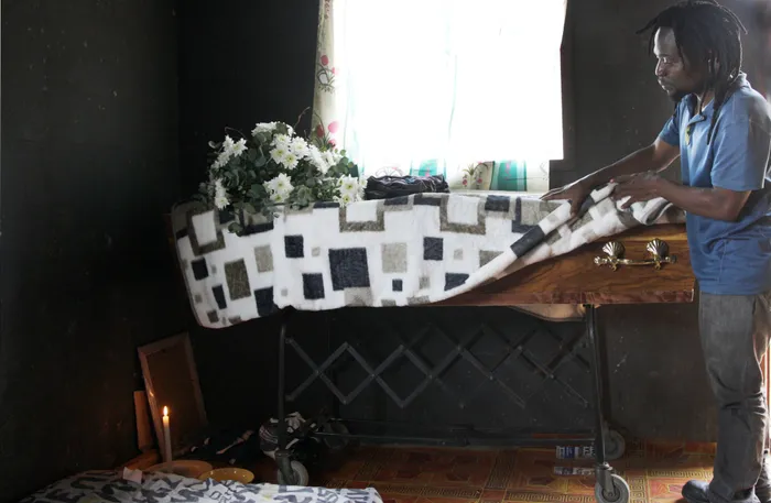 Lucky Ngcobo putting a blanket over the coffin of his younger brother, Ntokozo Ngcobo, whose head was chopped off after Teddy "Mafia" Pillay's murder in January in Chatsworth. I Bongani Mbatha /African News Agency (ANA)