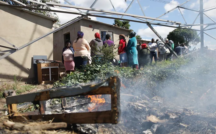 THE Zamani Informal Settlement community gathered in the yard where six people, including a 14-year-old boy, were killed. Picture: Bongani Mbatha African News Agency (ANA)