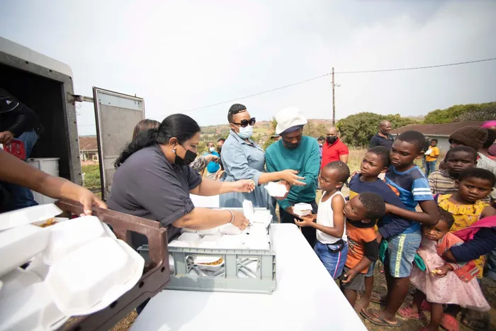 Blackburn residents as they lined up to receive their 1 000 hot meals that were provided by Food for Life during a social cohesion initiative that was sponsored by the Sibaya Community Trust together with other charitable organisations. Picture: Supplied