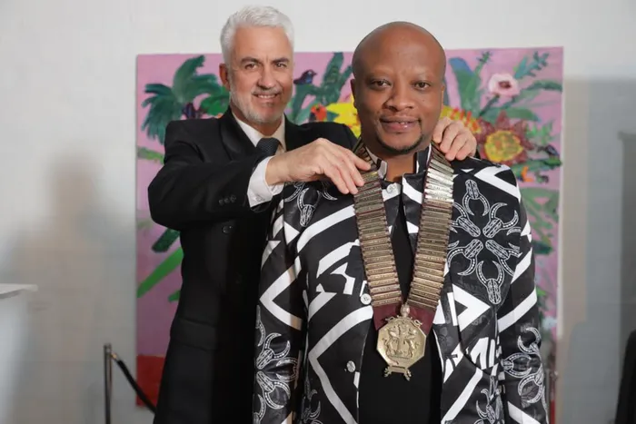 Patrick Smith, the outgoing president handing over the 120-year-old Chain of Office to the newly elected president Sikhumbuzo Mtembu. Picture: ODMedia: Geoff Redman