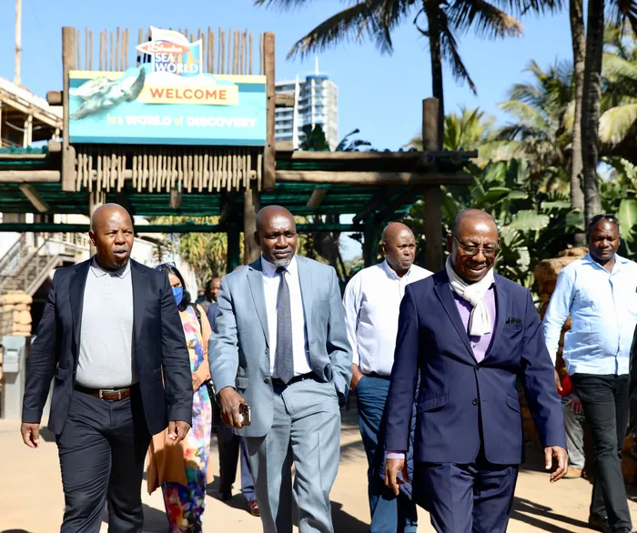 ANC eThekwini councillor Nkosenhle Madlala, eThekwini Municipality mayor Mxolisi Kaunda and the eThekwini executive committee members are led by Durban Marine Theme Park (DMTP) CEO Ndabo Khoza on an on-site inspection of uShaka Marine World. Picture: Zainul Dawood