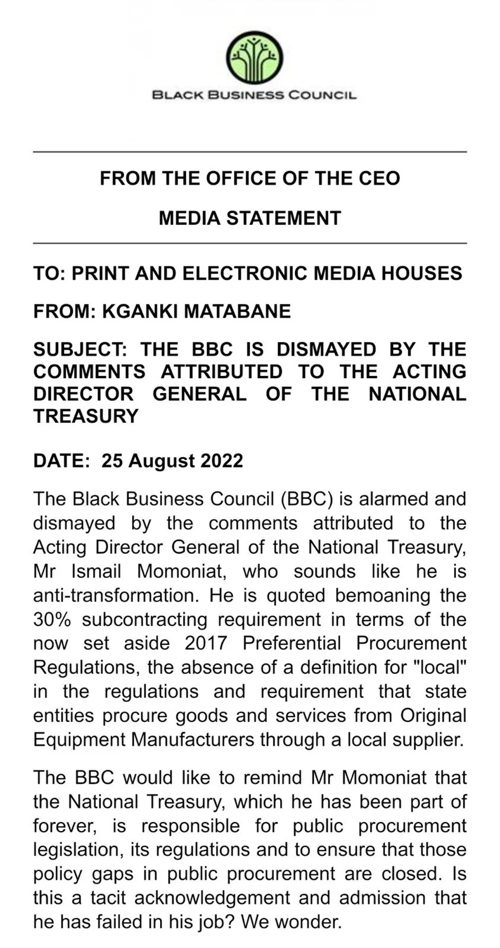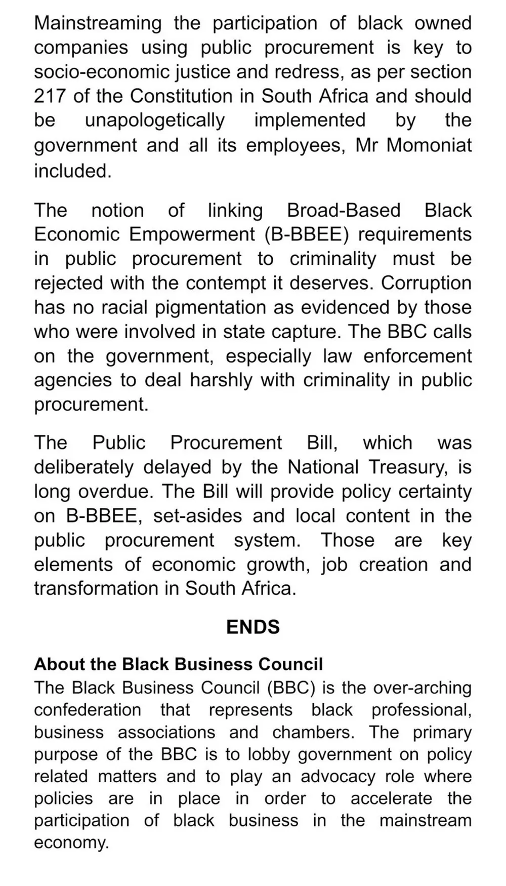 “Mainstreaming the participation of black-owned companies using public procurement is key to socio-economic justice and redress, as per section 217 of the Constitution in South Africa and should be unapologetically implemented by the government and all its employees, Mr Momoniat included,” the council said in a statement.
