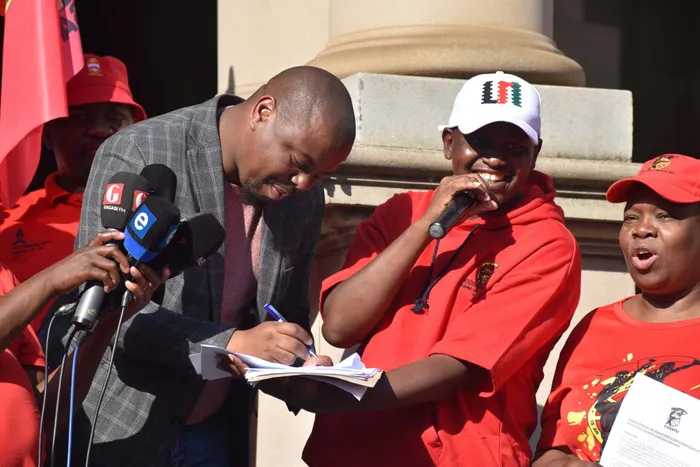 KZN MEC for Transport and Community Safety and Liaison Sipho Hlomuka received and signed the memorandum from Cosatu, which laid out the grievances of the people, such as high petrol price, high food prices, gender-based violence, corruption in government entities and crime in communities . Picture: Tumi Pakkies/African News Agency (ANA)