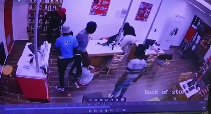 In a video that has gone viral on social media, at least 7 armed suspects entered a Vodacom store in Windermere Centre, Morningside, and robbed staff, customers and the store. | Screenshot