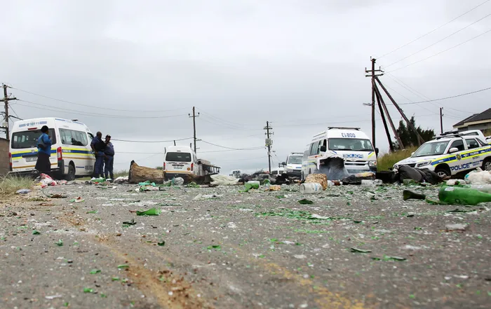 Police standing after restoring calm to the Folweni residents at ward 95 after closed the M35 main road demanding water and electricity. l TUMI PAKKIES/AFRICAN NEWS AGENCY (ANA)