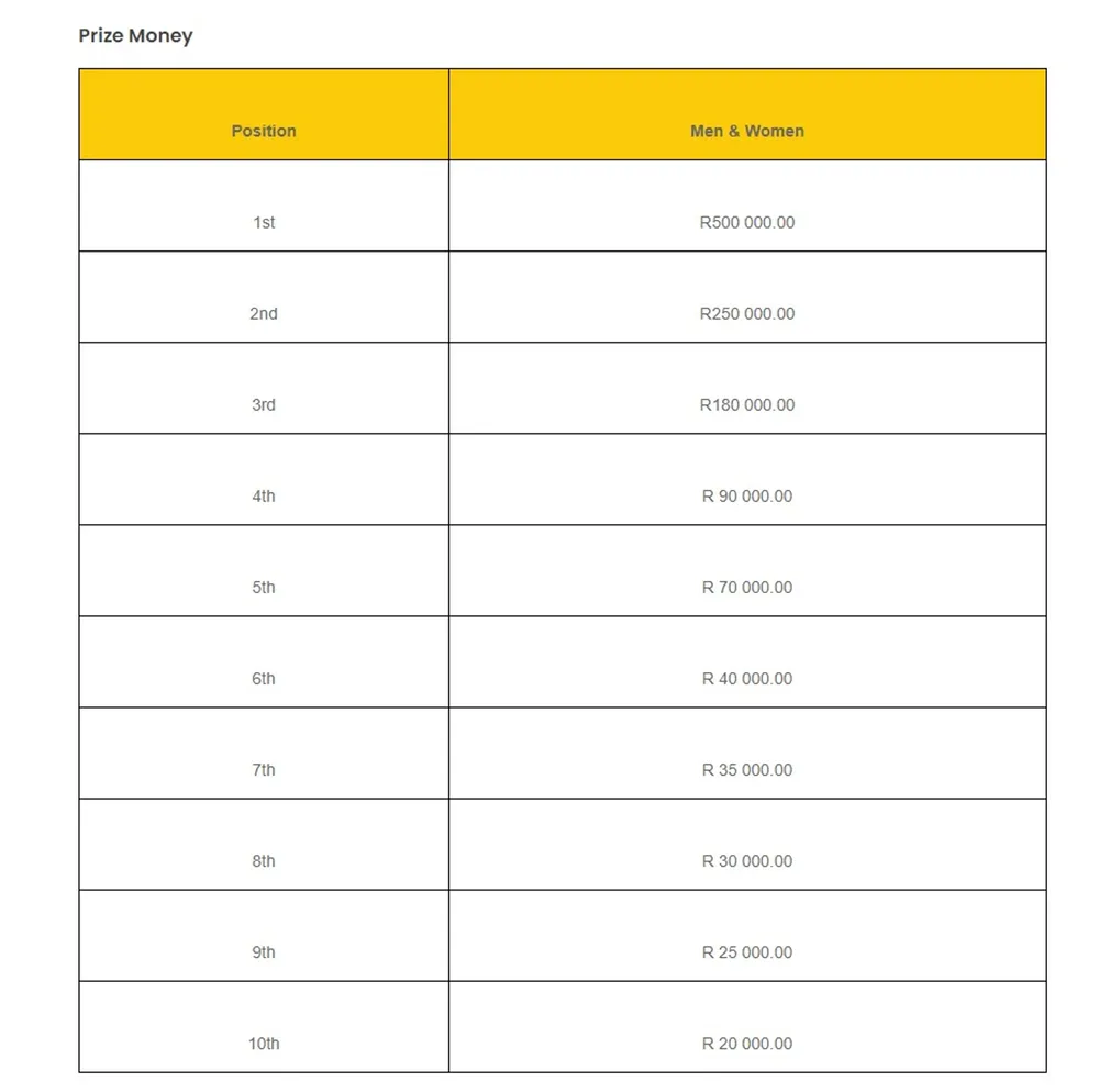 In addition to the prize money, 1-ounce pure gold medals valued at around R38 000 each are awarded to the first 10 men and the first 10 women.