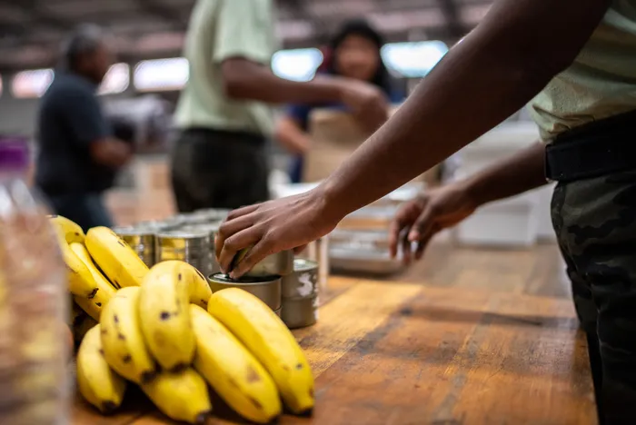 Hands placing canned food on the table next to bananas at a community centre. Sanlam's R1.5 million donation equates to 310 000 meals between May and July 2023, and it will go directly to the impacted schools in the provinces and will be facilitated by the Lunchbox Fund. Picture: Supplied
