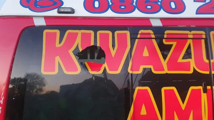 As one of the medics was taking cover, a bullet impacted the ambulance, narrowly missing the medic’s head. Picture: KwaZulu Private Ambulance