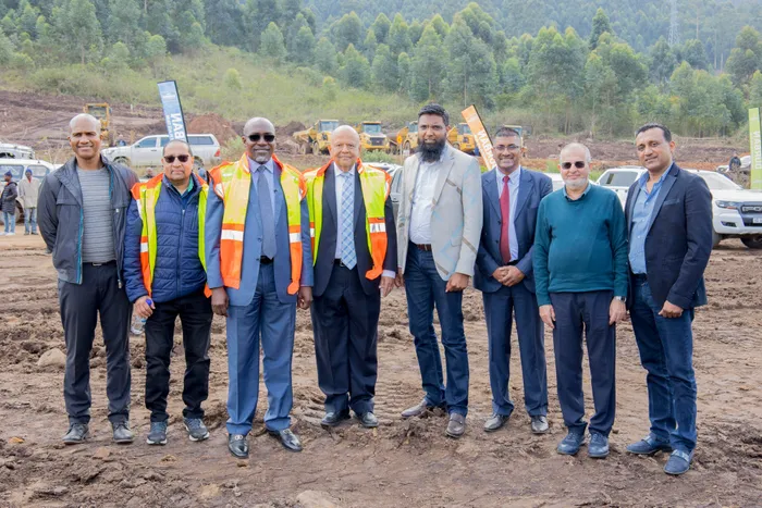 At the sod turning held on the site of Giba Business Estate were, from left, Nel Nathoo, George Mohlakoana, Durban mayor Mxolisi Kaunda, Pravin Gordhan, Shaaz Moosa, Pregan Naicker, Raffi Abdullah and Donavon Naicker. Picture: Supplied